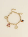 Poétique et solaire, ce bracelet en acier inoxydable se pare de pendentifs symboliques : des trèfles émaillés, un soleil rayonnant, un cœur en résine colorée et un oiseau martelé.
