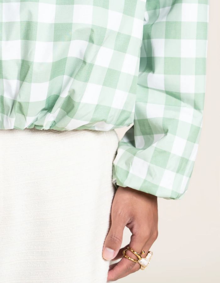 Le bomber Darius revisite les codes du vestiaire outdoor avec une allure résolument moderne. Sa coupe ballon associée à un crop ajusté structure la silhouette et apporte une touche mode forte, tandis que le motif vichy vert insuffle un esprit graphique et contemporain.