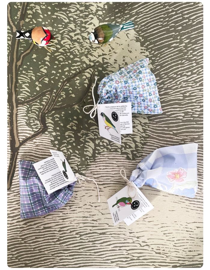 La figurine est livrée dans une pochette confectionnée à partir de draps de seconde main, dans une démarche artisanale durable.