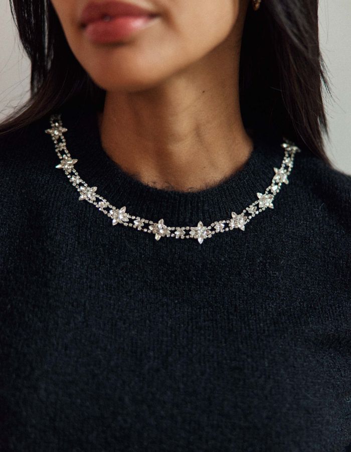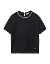 Un top noir en maille élégante, sublimé par des détails bijoux scintillants, idéal pour un look sophistiqué du jour comme du soir.