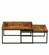 Ce set de deux tables basses séduit par son alliance réussie entre teck recyclé et métal noir, pour un style à la fois moderne, chaleureux et authentique. Les plateaux présentent un superbe motif géométrique en lattes, véritable signature visuelle qui rend chaque pièce unique.