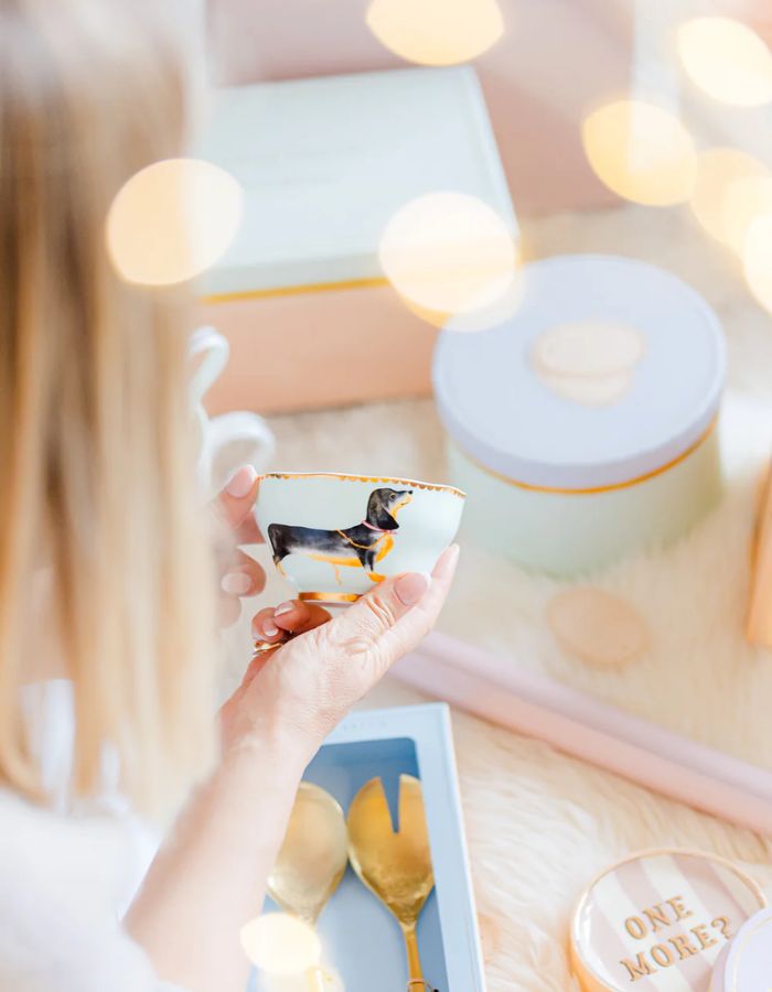 Succombez au charme irrésistible de la Yvonne Ellen Sausage Doggie Bowl, un bol au design ludique et raffiné, parfait pour servir vos douceurs avec style. Sa teinte bleu pastel subtile, rehaussée de détails dorés délicats, apporte une touche sophistiquée à toute décoration de cuisine.