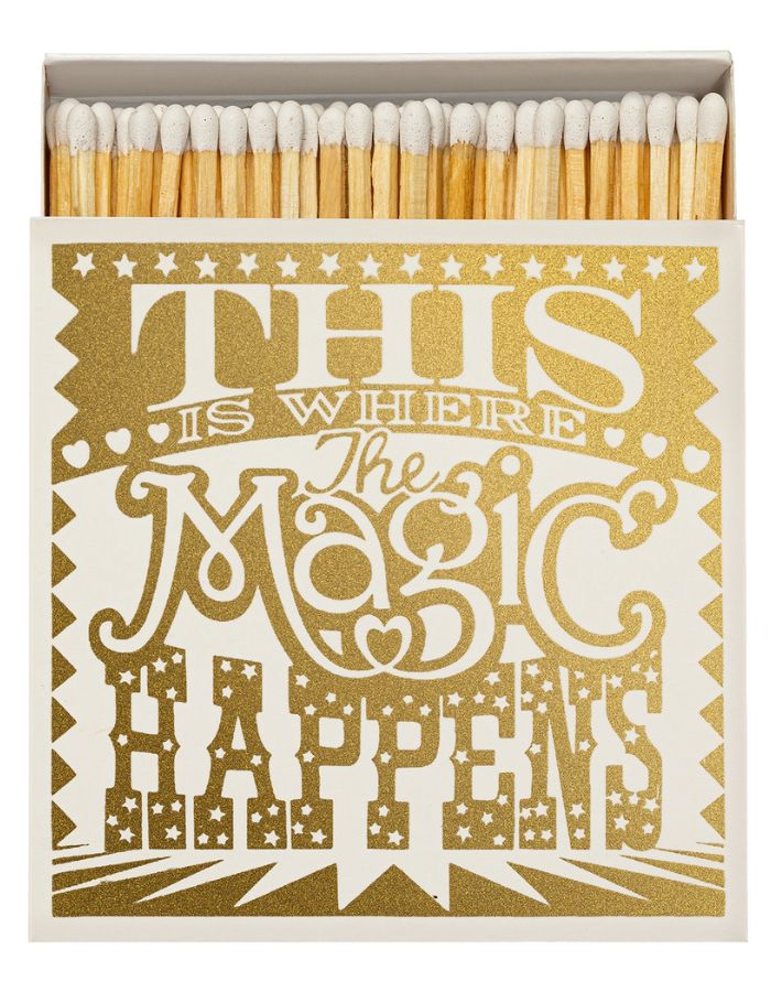 Allumez une touche de magie au quotidien avec la boîte d’allumettes Magic Matches, une pièce à la fois utile et décorative. Présentée dans une boîte carrée au design élégant, elle arbore un fond doré sérigraphié et une typographie blanche affirmée : “This Is Where The Magic Happens”.
