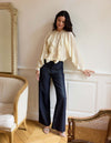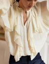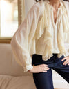 Une blouse écrue raffinée et intemporelle, parfaite pour un look bohème chic, à associer aussi bien avec un jean casual qu’une jupe fluide.