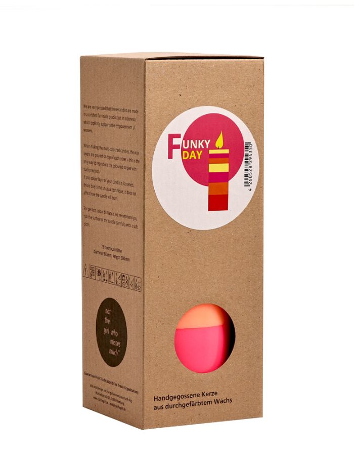 Coulée à la main à partir de cire végétale teintée dans la masse, la bougie Funky Day est une véritable pièce unique. Les différentes couches colorées sont assemblées manuellement pour un rendu précis et vibrant. Chaque exemplaire est soigneusement emballé dans une boîte en carton naturel robuste, imprimée en anglais et en allemand, parfaite pour offrir ou s’offrir.