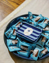 • Design : Motif rayé bleu, étiquette amovible, réutilisable en vide-poche.