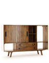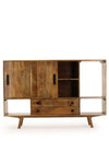 Ses portes coulissantes, ses niches ouvertes et ses deux tiroirs pratiques permettent une organisation optimale : vaisselle, livres, objets déco ou linge de maison trouvent facilement leur place. Le mélange du manguier et de touches de fer apporte une note subtilement industrielle, tout en conservant une finition naturelle raffinée.