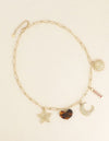 Il se compose de pendentifs martelés en forme de lune, soleil et étoile, d’une plaquette “AMOUR” émaillée et d’un cœur en résine léopard au look audacieux.