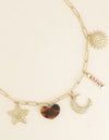 Design : pendentifs lune, soleil et étoile martelés, plaquette “AMOUR” en émail, cœur en résine léopard