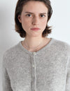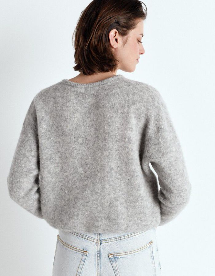 gilet gris clair femme, gilet laine alpaga, gilet court boutonné, maille douce hiver, gilet fluffy American Vintage