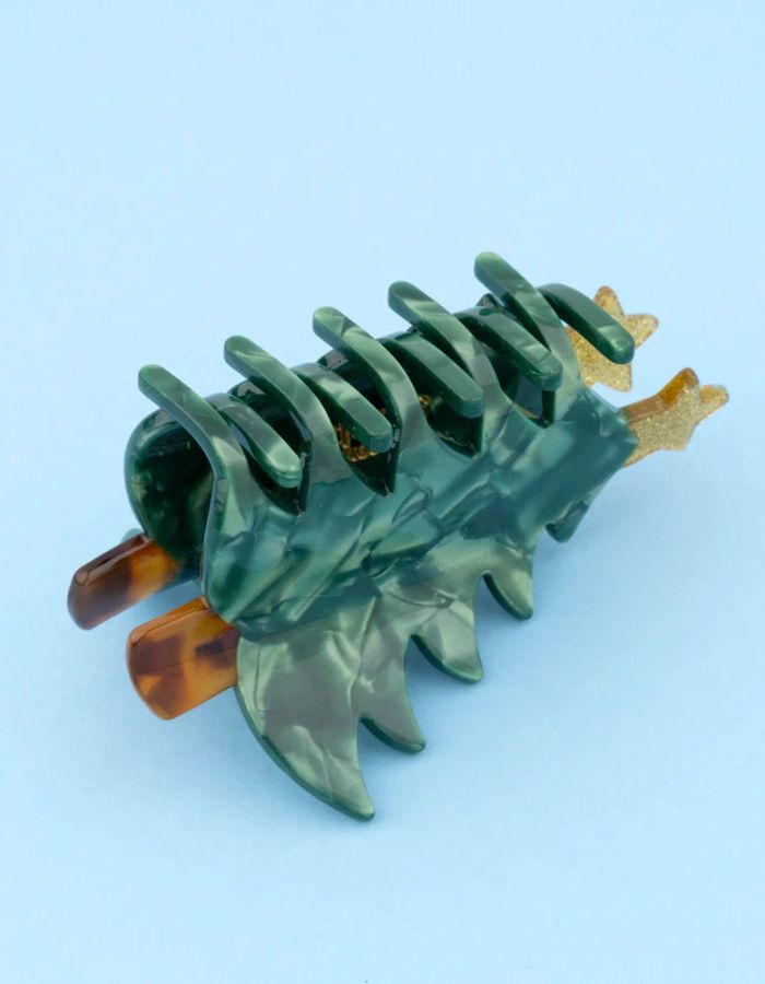 Faites briller vos coiffures de fin d’année avec la pince à cheveux Sapin, un accessoire joyeux et scintillant qui incarne toute la magie de Noël. On adore son feuillage vert profond, son tronc effet écaille de tortue et sa petite étoile dorée pailletée qui illumine l’ensemble.