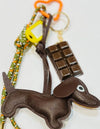Son design associe un petit chien en cuir à une fausse tablette de chocolat, pour une note ludique et sucrée. Les cordons colorés et la lanière en cuir ajoutent une touche pratique et élégante, permettant de l’accrocher facilement à vos clés ou à votre sac.