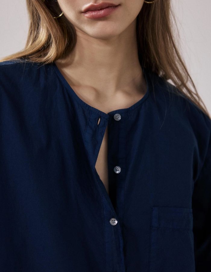 Confectionnée en popeline 100 % coton teint en pièce, elle offre une couleur profonde et unique, ainsi qu’un toucher peau de pêche doux et agréable. Sa coupe courte, son col rond sans col traditionnel, sa demi-patte de boutonnage et sa poche poitrine dessinent une silhouette simple et moderne.
