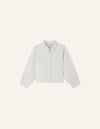 Sa fermeture boutonnée sur le devant, soulignée par un bouton bijou au pied de col, apporte une note précieuse. Les manches 3/4 ballon et les détails de plis en bas de manches créent un volume subtil et élégant. Les poches plaquées et les empiècements surpiqués devant, dos et bas de manches renforcent son caractère, tandis que les surpiqûres contrastées structurent la silhouette.