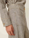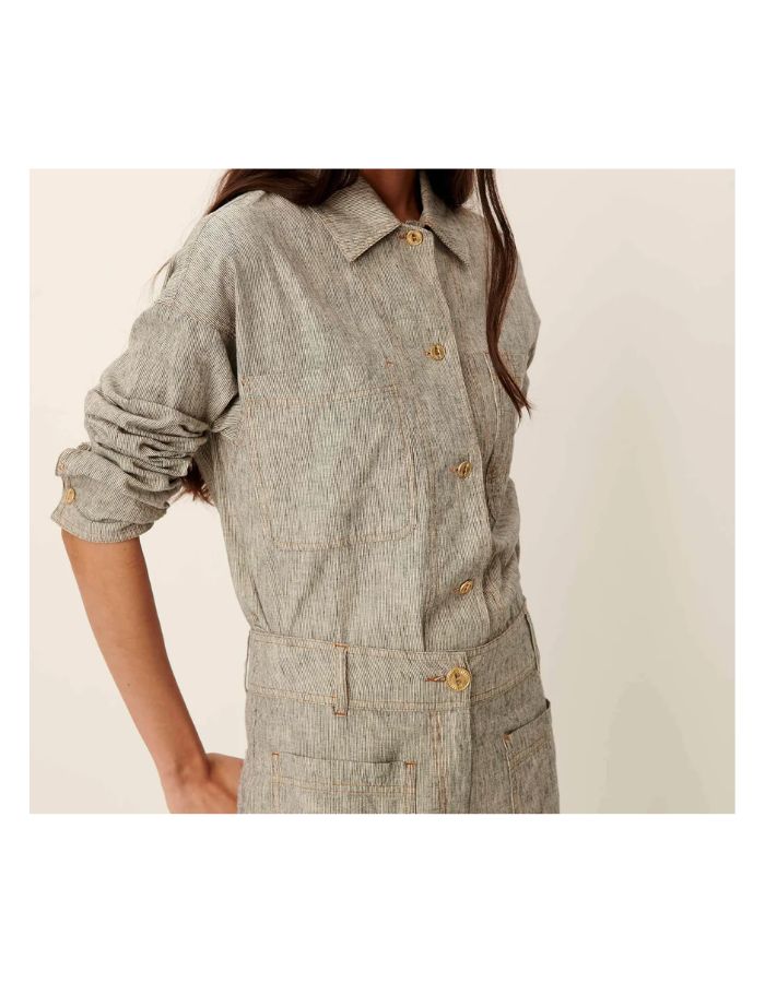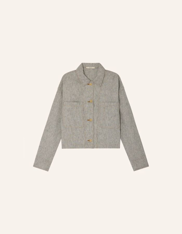 La surchemise Notteri incarne l’équilibre parfait entre esprit utilitaire et élégance naturelle. Confectionnée en toile de lin et coton à fils flammés, elle se distingue par ses rayures bicolores et sa texture subtilement irrégulière. Le tissu, tissé en Espagne, offre tenue et légèreté pour une silhouette structurée et confortable.